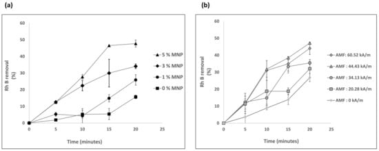 Removal of RhB without SPS (a) at different MNP concentrations in the nanocomposites in an AMF strength of 34.13 kA/m; (b) at different strengths of AMF with a nanocomposite of 3% MNP. (N = 3, error bars represent the standard deviation).