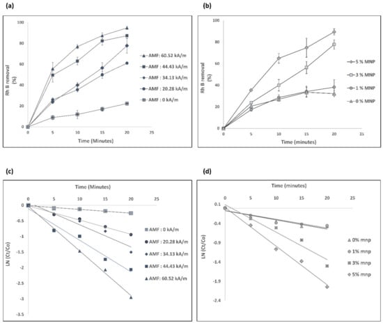 Removal of RhB with SPS (a) at different strengths of AMF with a nanocomposite of 3% MNP; (b) with different MNP concentrations in nanocomposites with an AMF strength of 34.13 kA/m. Pseudo-first-order plot of the RhB degradation (c) at different strengths of AMF with a nanocomposite of 3% MNP; (d) at different MNP concentrations in the nanocomposite with an AMF strength of 34.13 kA/m; (N = 3, error bars represent the standard deviation).