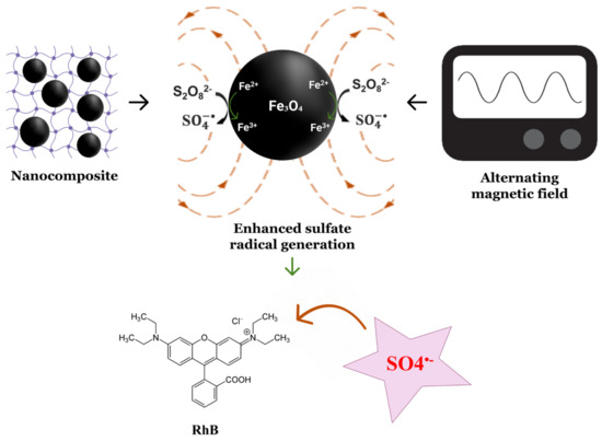Magnetic nanoparticles (MNPs) based on iron oxide exhibit excellent catalysis in a heterogeneous Fenton-like system, which is attributed to the presence of Fe(II) species in the magnetite structure that initiates the reaction []. When magnetic nanoparticles are enclosed in or coated with a non-magnetic matrix, the resulting composite is referred to as a magnetic nanocomposite; these have applications in biomedical and environmental fields []. Magnetic nanocomposites combine the features of a matrix or coating material with the intrinsic magnetic properties of nanoparticles, such as superparamagnetic properties. These superparamagnetic qualities enable manipulation in an external magnetic field without net remanent magnetization when the external magnetic field is removed. Additionally, the magnetic separation resulting from the MNPs is a simple, low-cost method for extracting contaminants from polluted water or slurries and is frequently more effective than procedures such as centrifugation and membrane filtration [,,,,,]. These distinctive properties of nanocomposites with MNPs have led to their development for environmental remediation applications. Leng et al. used polyhydroquinone-coated iron oxide to activate persulfate and then degrade RhB. In addition, they found that an increase in temperature accelerated RhB decomposition, which matched the pseudo-first-order kinetic model []. In a similar study, Pang et al. developed magnetic graphene oxide and used it to activate persulfate and then degrade 2,4-dichlorophenol. They reported that the synergistic effect of magnetic nanoparticles and graphene oxide enhanced persulfate activation and the radicals dispersed on the catalyst’s surface degraded the most 2,4-dichlorophenol [].
