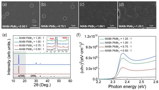 Figure 1a–d shows top-view SEM images of the MAPbBr3 thin films on the FTO substrates formed using the precursor solutions with the different MABr contents. These images clearly show distinct variations in the film morphologies. As shown in Figure 1a–d, an increase in the MABr content of the precursor solution increased the surface grain size of the coated MAPbBr3 thin film. However, pinholes were observed due to incomplete surface coverage except for the 1:1 molar ratio of MABr:PbBr2. As a result of the observed pinholes, we determined that the optimal MABr:PbBr2 molar ratio for producing the MAPbBr3 thin film was 1:1, as pinholes can create shunt paths in the PSCs. Dense and pinhole-free MAPbBr3 thin films are essential for improving the performance of PSCs. Figure 1e shows the XRD patterns of the MAPbBr3 OIHP films with the different MABr contents. For all the samples, strong peaks were observed at 14.90° and 30.05°, which corresponded to the (100) and (200) lattice planes, respectively, thus confirming the formation of a cubic perovskite structure [35]. However, in the case of the coatings formed using solutions containing an excessive amount of PbBr2 or MABr, the conversion of the OIHP film was incomplete. Therefore, the corresponding PbBr2 and MABr peaks are presented in the inset of Figure 1e [36,37,38]. The peak intensity of the film with a MABr:PbBr2 molar ratio of 1:1 was higher than other ratios (1.25:1, 0.75:1, and 0.5:1 molar ratio of MABr:PbBr2), which may be attributed to the complete crystallization of the film. Furthermore, the absence of any additional peaks in the XRD pattern of the film with 1:1 molar ratio of MABr:PbBr2 confirms its good crystallinity. The UV-Vis spectra in Figure 1f show the light absorption properties of the MAPbBr3 OIHP films with the different MABr contents. MAPbBr3 exhibits a characteristic absorption band at approximately 535 nm, which corresponds to a bandgap (Eg) of 2.32 eV [12,39,40]. Changing the MABr molar ratio in perovskite precursor solution from 0.5 to 1 resulted in a slight increase in the absorbance, which then decreased when the molar ratio was changed further to 1.25. This change can be attributed to the crystallinity of the MAPbBr3 OIHP thin film [40].
