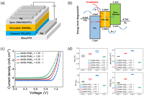 (a) Structure of MAPbBr3 PSCs. (b) Schematic of energy band diagrams of n-i-p device with FTO/TiO2/MAPbBr3/Spiro-OMeTAD/Ag structure. (c) J-V curves and (d) box charts of device parameters of MAPbBr3 PSCs formed using MABr:PbBr2 molar ratios of 1:0.5, 1:0.75, 1:1, and 1:1.25.