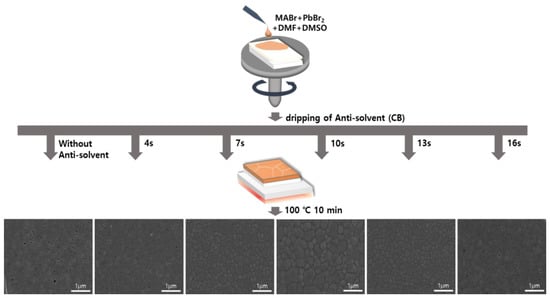 A schematic for controlling the anti-solvent dripping time for an OIHP precursor solution fixed at an MABr:PbBr2 molar ratio of 1:1 is shown in Figure 3. The MAPbBr3 precursor solution was first dropped onto the FTO/TiO2 substrate and then subjected to spin-coating. The solvent of the MAPbBr3 solution evaporated during the spin-coating process, resulting in the formation of an OIHP layer. When the anti-solvent was not used, the unstable MAPbBr3 layer formed at the end of the spin-coating process and had low surface coverage. On the other hand, the drop of an anti-solvent during the spin-coating process of the MAPbBr3 solution resulted in the formation of a uniform, dense, and pinhole-free MAPbBr3 thin film due to rapid crystallization via improved nucleation and growth. This treatment facilitated the removal of the host solvent(s) and initiated the crystallization of the OIHP film. Therefore, high-quality MAPbBr3 OIHP films can be obtained by using an anti-solvent and optimizing its dripping time. To investigate the effects of anti-solvent dripping time on the quality of the OIHP films formed, five different dripping times (4, 7, 10, 13, and 16 s) were tested. Figure 3 shows top-view SEM images of the MAPbBr3 OIHP films formed using different dripping times. The MAPbBr3 films formed with dripping times of 7~13 s were uniform, dense, and flat. The film formed with a dripping time of 10 s had a larger grain size, homogeneous, and smoother surface. However, the films formed with dripping time of 4 and 16 s had low surface coverage, and numerous pinholes were observed. Therefore, the SEM results indicate that a dense and uniform MAPbBr3 film with a suitable grain size can be achieved using an appropriate anti-solvent dripping time.