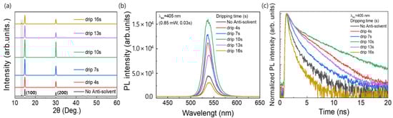 (a) XRD patterns, (b) PL, and (c) TRPL spectra of MAPbBr3 films formed using different anti-solvent dripping times.