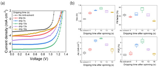 (a) J-V curves and (b) box charts of device parameters of MAPbBr3 PSCs based on films formed using different anti-solvent dripping times.