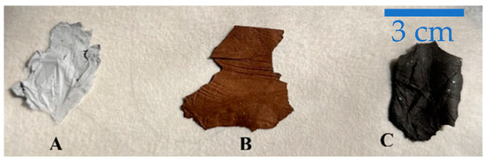 A portion of 10%ZnS–GO/CNF nanofibers after each heat treatment (A) post spinning, (B) post stabilization, (C) post carbonization.