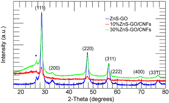 XRPD patterns of the ZnS–GO (blue), 10%ZnS–GO/CNF (red) and 30%ZnS–GO/CNF (green) samples. (002) plane of graphitic carbon (*) and Miller indices of the sphalerite phase are also shown.