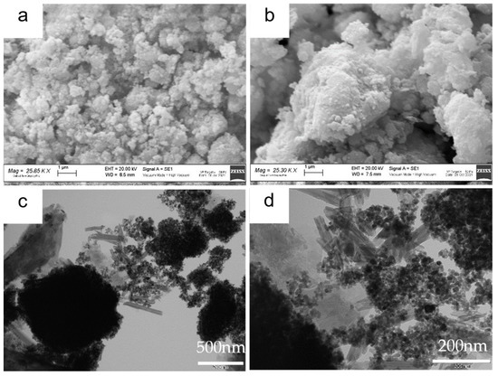 In the 10%ZnS–GO/CNF sample (Figure 5a,b), the ZnS–GO agglomerates are clearly observed, both between nanofibers and connecting them, and within the nanofibers. Each agglomerate consists of nanometric particles of about 10 nm, while the CNF’s diameter is about 200 nm. The 30%ZnS–GO/CNF sample shows similar features. ZnS–GO nanoparticles of 13 nm are present, both between and embedded into nanofibers, and the CNF’s diameter is about 150 nm.