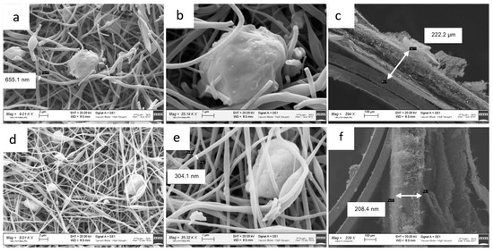SEM images of 10%ZnS–GO/CNF sample: (a) and (b) at 9 and 25 kX, respectively, and (c) cross-section. SEM images of 30%ZnS–GO/CNF sample: (d) and (e) at 9 and 25 kX, respectively, and (f) cross-section.