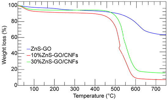The thermogravimetric curves of ZnS–GO, 10%ZnS–GO/CNF and 30%ZnS–GO/CNF samples are shown in Figure 8.