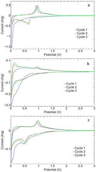 In the case of the ZnS–GO sample (Figure 10a), the anodic and cathodic peaks display a current intensity higher than 0.5 A g−1, and quite high ΔV values of about 0.3 V, which highlight polarization phenomena. While the anodic peaks are detected at 1 V, the cathodic peak at 0.9 V moves to 0.5 V–0.7 V after the first cycle and the formation of SEI. Finally the peaks are not perfectly overlapped, confirming that the redox reversibility is not strong.