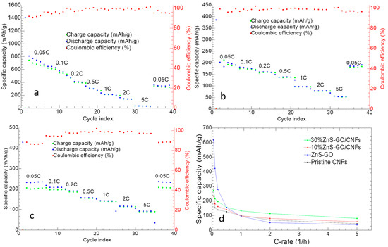 Charge/discharge cycles at different C-rates of (a) ZnS–GO, (b) 10%ZnS–GO/CNF and (c) 30%ZnS–GO/CNF samples. (d) Samples’ capacity vs. C-rates. Charge (green), discharge (blue) and coulombic efficiency (red).