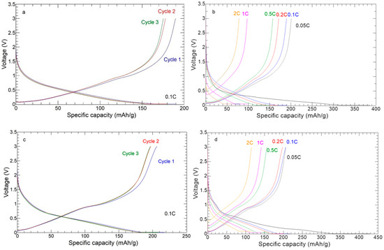 Charge/discharge curves: (a) three cycles at 0.1 C of 10%ZnS–GO/CNF; (b) one cycle at each C-rate of 10%ZnS–GO/CNF; (c) three cycles at 0.1 C of 30%ZnS–GO/CNF; (d) one cycle at each C-rate of 30%ZnS–GO/CNF.