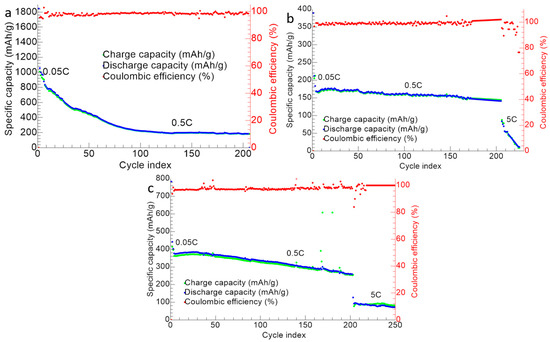 Finally, the 30%ZnS–GO/CNF sample (Figure 13c) has an initial capacity of 789 mAh g−1 at 0.05 C. In the following 200 cycles at 0.5 C, the cell displays better cyclability than the slurry, but worse than the 10% self-standing anode. Interestingly, the 30% self-standing electrode displays capacity values in the 255–400 mAh g−1 range for 200 cycles at 0.5 C. The charge and discharge capacities are overlapped and coulombic efficiencies ≥99% are reached. The electrode also displays good cycling performances at 5 C for other 50 cycles, showing a capacity of 80–90 mAh g−1, and the cell still works at the end of the cycling test. The capacity retention after 200 cycles is 69.57%.