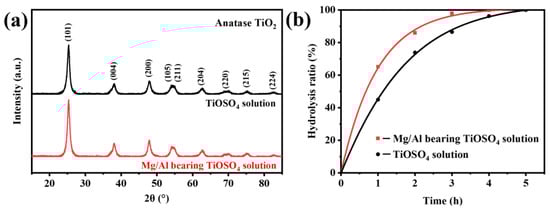 The fitting hydrolysis ratio curves are shown in Figure 1b. Both solutions were completely hydrolyzed under the hydrothermal condition of 120 °C within 5 h. However, the hydrolysis of the Mg/Al-bearing TiOSO4 solution is significantly faster than the pure TiOSO4 solution. The hydrolysis ratio of the former reached 65.2% after only 1 h and nearly 100% within 4.0 h, while for the latter, TiOSO4 was hydrolyzed only 44.9% after 1 h and completely after 5.0 h. The hydrolysis ratio gap between the two solutions first increased and then decreased, reaching a maximum of 20.2% at 1.0 h, which proves that MgSO4 and Al2(SO4)3 indeed promote the hydrolysis of TiOSO4, especially in the initial process.