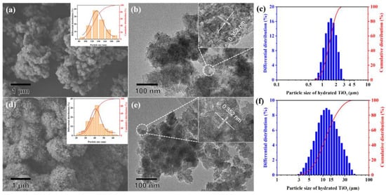 (a) SEM of hydrated TiO2 prepared from the Mg/Al-bearing TiOSO4 solution with an illustration of the primary agglomerate particle size distribution; (b) TEM of hydrated TiO2 prepared from the Mg/Al-bearing TiOSO4 solution; (c) Aggregate particle size distribution for the Mg/Al-bearing TiOSO4 solution; (d) SEM of hydrated TiO2 prepared from the TiOSO4 solution with an illustration of the primary agglomerate particle size distribution; (e) TEM of hydrated TiO2 prepared from the TiOSO4 solution; (f) Aggregate particle size distribution for the TiOSO4 solution.