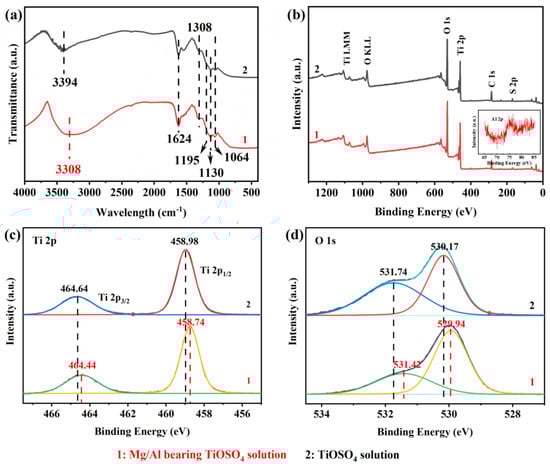 To explore the reasons for the significant effect of MgSO4 and Al2(SO4)3 on the hydrated TiO2, the surface features of the samples were characterized by FT-IR and XPS. As shown in Figure 3a, a broad absorption peak at about 3300 cm−1 attributed to the stretching of the -OH bond and a strong absorption peak at 1624 cm−1 due to H-O-H bending vibration appear in both samples, indicating the existence of surface hydroxyl groups and adsorbed water. A red shift from 3394 to 3308 cm−1 and a significantly increased integrated intensity of the -OH bond indicate the increased hydroxyl group and the decrease of the -OH bond force constant with the addition of MgSO4 and Al2(SO4)3. The characteristic peaks at 1308 cm−1, 1195 cm−1, 1130 cm−1 and 1064 cm−1 caused by O=S=O antisymmetric stretching vibration and O-S-O symmetric stretching vibration confirm the presence of SO42− on the surface. Meanwhile, no strong absorption band is found near 1370 cm−1, indicating that SO42− exists in the form of bidentate ligand rather than metal sulfate [23,24,25]. The overall XPS spectrum (Figure 3b) shows no peak of Mg, indicating that Mg did not exist on the surface of the hydrated TiO2. However, a weak peak of Al 2p was observed at 74.84 eV, even after the sample was fully washed, which proves the strong bonding between Al and the hydrated TiO2. The deconvoluted results (Figure 3c) present two peaks at 458.74 and 464.44 eV, attributed to Ti 2p1/2 and 2p3/2. Their shift towards low binding energy indicates a higher electron density of hydrated TiO2 for the Mg/Al-bearing TiOSO4 solution. The strong shoulder peak in Figure 3d at 529.94 eV is attributed to the Ti-O-Ti lattice oxygen, while the weak one at 531.42 eV is due to the surface hydroxyls and adsorbed water. The higher intensity of the strong shoulder peak and lower intensity of the weak one proves that the hydrated TiO2 has more lattice oxygen, less surface hydroxyl and adsorbed water in the Mg/Al-bearing TiOSO4 solution and the latter is related to the smaller surface area (Figure 2a). The offset of two peaks confirms a higher electron density for both the lattice and surface oxygen.