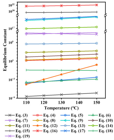 In order to explore the main cause for the promoting effect of MgSO4 and Al2(SO4)3 on the hydrolysis of TiOSO4, the thermodynamic equilibrium calculation was carried out. The reaction equations involved in the Mg/Al-bearing TiOSO4 solution are listed in Equations (1) and (3)–(19). Those equations related to the TiOSO4 solution are Equations (1), (3), (4), (18) and (19). The thermodynamic data for all species are cited from reference [26], and the corresponding reaction equilibrium constants at 110–150 °C are shown in Figure 4.