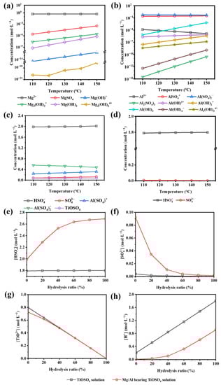 Initial equilibrium concentration: (a) Mg-containing components; (b) Al-containing components; (c) S-containing components in the Mg/Al-bearing TiOSO4 solution; (d) S-containing components in the TiOSO4 solution; the curves of the ion concentration with the hydrolysis ratio: (e) TiO2+; (f) H+; (g) HSO4−; (h) SO42−.