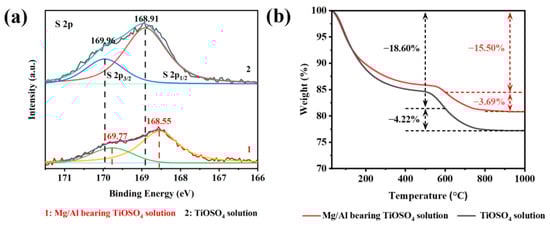 The (a) S 2p XPS and (b) TGA of hydrated TiO2 in the Mg/Al-bearing TiOSO4 solution and the TiOSO4 solution.