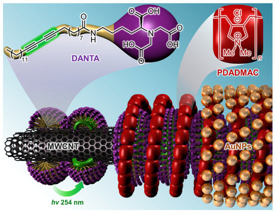The assembly of gold nanoparticles (AuNP) on the CNT surface was achieved by a process previously developed in our group (Figure 4) [31] using a layer-by-layer approach consisting of: (i) the addition of a polymerizable amphiphile (DANTA) to the nanotube, (ii) photopolymerization, (iii) the addition of a cationic polymer (PDADMAC), and (iv) the addition of AuNP to the multilayer assembly. The AuCNT hybrid was obtained as an aqueous dispersion, and the gold concentration was measured by ICP-MS ([Au] = 6 mM).