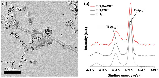 (a) TEM picture of TiO2/AuCNT; (b) XPS analyses of TiO2, TiO2/CNT, and TiO2/AuCNT.