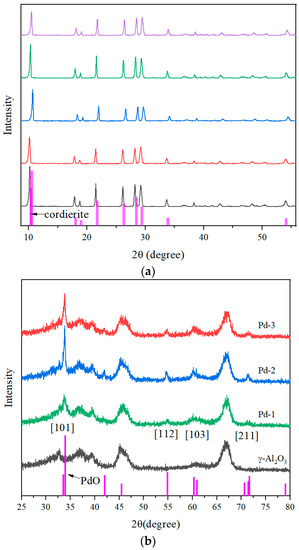 In Figure 1a, Al2O3/COR and Pd-1, Pd-2, Pd-3 have similar diffraction peaks with the sample of COR, indicating that the coating of γ-Al2O3 and the loading of Pd would not alter the crystal structure of cordierite. A series of characteristic peaks of cordierite (ICSD/JCPDS#:85-1722) could be observed at 2 θ = 10.35°, 10.45°, 18.04°, 18.95°, 21.69°, 26.28°, 28.43°, 29.40°, 33.74°, and 54.09°, corresponding to [200], [110], [310], [002], [202], [312], [222], [421], [512], and [624] planes. In addition, no obvious diffraction peaks of Pd species were observed in the XRD patterns, which should be related to the low loading and the high dispersion of Pd species [17,18,19].
