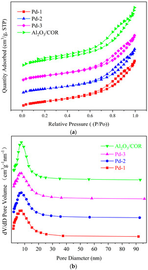 The N2 adsorption-desorption isotherms and the corresponding BJH pore size distribution curves of Al2O3/COR, Pd-1, Pd-2, and Pd-3 are displayed in Figure 2. Specific surface area, pore volume, and mean pore size are shown in Table 2.