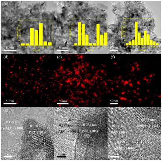 In order to observe the distribution of Pd species, Pd-1, Pd-2 and Pd-3 were characterized by TEM, HRTEM, and EDS. The results are shown in Figure 3. The sizes of PdO nanoparticles (NPs) in Pd-1, Pd-2, and Pd-3 were measured and counted, and the results are presented in the insets of Figure 3a–c. As shown in Figure 3a and its column chart, the main size of PdO NPs in sample Pd-1 was between 7–10 nm, while the size distribution in Pd-2 and Pd-3 is less uniform. For Pd-2, the particle size was mainly below 8 nm and above 14 nm. The particle size distribution of Pd-3 is rather wide, from 2 nm to 22 nm. It can be judged that the dispersion of Pd species in Pd-1 was higher while in Pd-2 and Pd-3 were lower, and the PdO NPs were aggregating in Pd-2 and Pd-3. Meanwhile, the EDS mapping in Figure 3d shows that Pd species in Pd-1 were uniformly distributed on the support, while it was irregularly dispersed in Pd-2 (Figure 3e) and Pd-3 (Figure 3f). This is consistent with the results of XRD.