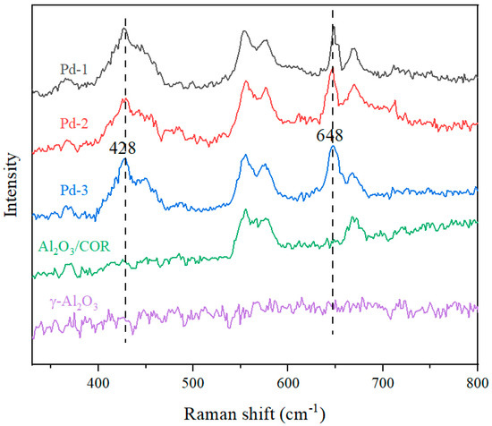 To gain a better understanding of the catalysts, Pd-1, Pd-2, Pd-3, Al2O3/COR, and Al2O3 were characterized by Raman spectroscopy. The results are shown in Figure 4. Pd-1, Pd-2 and Pd-3 samples all contain cordierite and γ-Al2O3, so the Raman spectra of Al2O3/COR and Al2O3 are used for comparison. The sample Al2O3 has no band between 330 cm−1 and 800 cm−1, and Al2O3/COR showed bands at 555 cm−1, 575 cm−1, and 668 cm−1, which all arose from cordierite. Compared with Al2O3/COR, Pd-1, Pd-2, and Pd-3 loaded with Pd species showed different characteristic bands at 428 cm−1 and 648 cm−1. The band at 428 cm−1 belongs to the Eg of Pd-O bond, while the band at 648 cm−1 is proved to be B1g of Pd-O bond [23,24]. These two Pd-O bonds do not belong to bulk PdO. It is considered that PdO is obtained by oxidation of Pd species, which attached to the surface of γ-Al2O3, and can be used for catalytic oxidation of VOCs molecules at once.