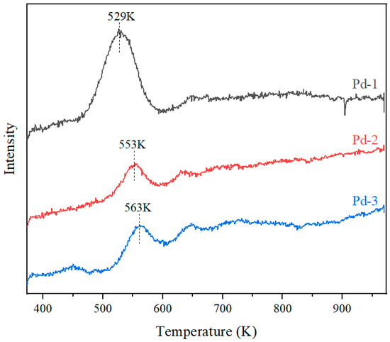 The catalytic oxidation performance of catalysts is related to the reduction performance of oxygen species on the active component. The lower the reduction temperature of oxygen species and the greater the reduction amount, the better the active oxygen supply performance and the higher the catalytic oxidation activity of the catalysts [25]. The reducibility of metal oxides in the catalysts can be measured by the temperature programmed reduction of hydrogen. It is generally believed that the lower the reduction temperature of the active components and the greater the hydrogen consumption, the better the active oxygen supply performance of the active components [7]. To estimate the reducibility of Pd-1, Pd-2, and pd-3, H2-TPR measurements were conducted, and the results are shown in Figure 5.