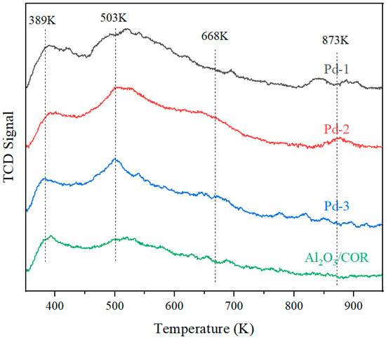 It was reported that the weak acid sites of the catalysts had suitable adsorption strength for VOCs, which was beneficial to the activation and catalytic oxidation of VOCs [7,28]. In contrast, the adsorption intensity of VOCs on medium and strong acid sites was too high, so the adsorbed VOCs were difficult to be activated, which limited the catalytic oxidation efficiency of VOCs [25,27]. It can be seen from Figure 6 that Al2O3/COR has acidic sites. Two peaks are observed at 389 K and 503 K, respectively, belonging to weak acid sites. For Pd-1, Pd-2 and Pd-3, their ammonia desorption peaks at 503 K are significantly higher than the peak at 389 K. What’s more, two other ammonia desorption peaks are observed at 668 K and 873 K, belonging to medium-strong acid sites and the strong acid sites, respectively. According to Table 4, the loading of Pd species greatly increased the number of weak acid sites. For medium and strong acid sites, the precursors of Pd-1, Pd-2, and Pd-3 have limited effect on them. Generally, the surface acidity of Pd-1 is most suitable for the adsorption and oxidation of VOCs.
