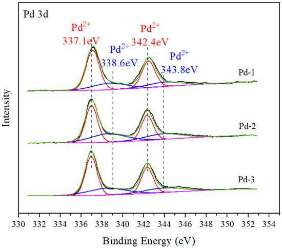 To explore the existing form and valence proportion of Pd species in catalysts, Pd-1, Pd-2 and Pd-3 were analyzed by XPS characterization. When using XPS to measure insulators or semiconductors, it is necessary to correct the deviation caused by charge effect. The C1s of external carbon source is usually used as the reference peak for correction. The difference between the measured value and the reference value (284.8 eV) is used as the charge correction value (Δ) to correct the binding energy of other elements in the spectrum. The results are shown in Figure 7. The spectrum of Pd 3d corresponded to spin-orbit splitting into 3d5/2 and Pd 3d3/2. After deconvolution of XPS patterns, Pd 3d peaks at 337.1 and 342.4 eV were corresponded to Pd2+, the peaks at 338.6 and 343.9 eV were corresponded to Pd4+ and Pd0 was not detected in three samples as no signal at 335.1–335.4 eV is visible in Figure 7. Pd2+ species were generally considered to be the active centers in the catalytic oxidation of hydrocarbons [22]. Based on peak area in Figure 7, the proportion of Pd2+/(Pd2+ + Pd4+) was shown in Table 5. Among the three catalysts with the same Pd loading, it was obvious that the Pd2+/(Pd2+ + Pd4+) ratio of the catalysts Pd-1 was the highest. The lower the proportion of Pd2+ in Pd-2 and Pd-3, the less effective Pd2+ for the catalytic oxidation of VOCs molecules. Pd2+ species exist in the catalyst Pd-1, Pd-2 and Pd-3 as PdO.