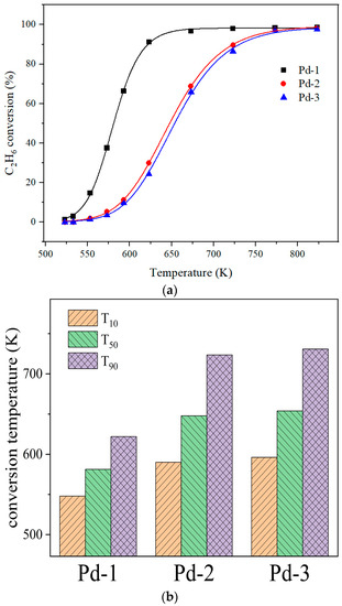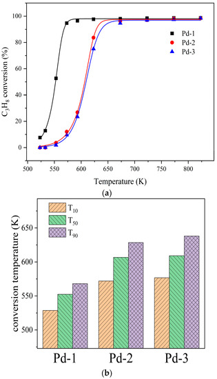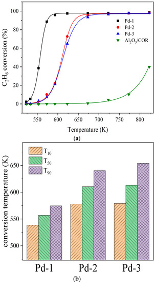Pd-1, Pd-2, Pd-3 and Al2O3/COR were evaluated in a fixed-bed reactor using ethane as a model reaction gas. The results are shown in Figure 8. T10, T50, and T90 are defined as the corresponding temperatures at which 10%, 50%, and 90% of reactant conversions can be obtained, respectively.