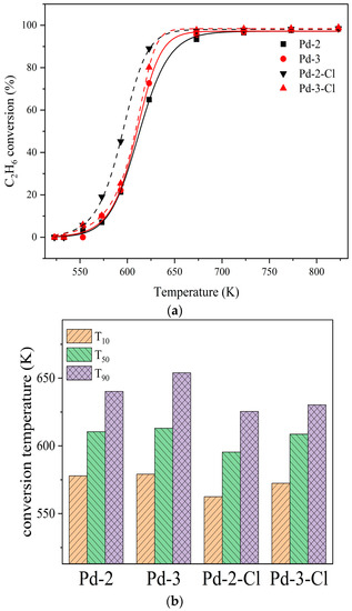 As can be seen from Table 7, the washing method still has some defects and cannot completely remove the Cl species. By comparing the activity curve before and after dechlorination in Figure 9, the ethane conversion efficiency of Pd-2 and Pd-3 increase by 24.1% and 7.48% after reducing the Cl content in Pd-2 and Pd-3 by 84.8% and 83.9%. The T10, T50, and T90 of Pd-2-Cl and Pd-3-Cl also decreased but their catalytic activities are worse than catalyst Pd-1. The T10, T50, and T90 of Pd-1 are correspondingly 538.6 K, 556.9 K and 574.6 K. These differences are caused by the large particle size of Pd NPs in Pd-2 and Pd-3. Although the root cause was the control effect of Cl species on the particle size, it cannot be remedied by removing Cl species, and can only reduce the effect of catalysts poisoning by Cl species.