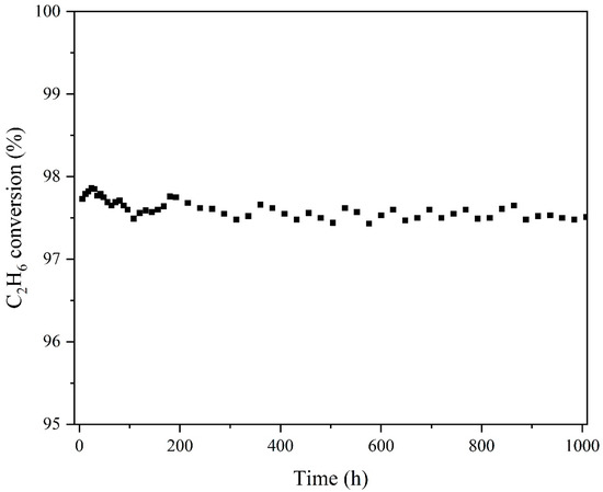The feed gas was changed into ethane containing 5% water vapor by volume to study the catalytic efficiency of the catalysts in practical application and the remaining conditions remained unchanged. The catalysts were evaluated again.