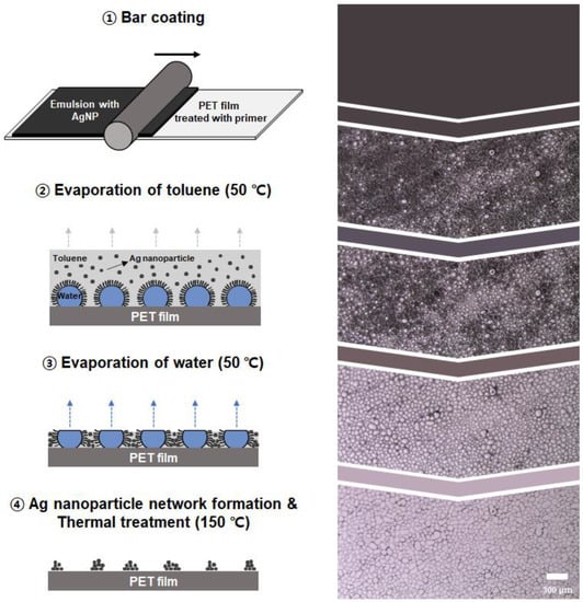 Thus far, AgNPs have been mainly studied in combination with other materials, such as graphene nanosheets [], Ag nanowires [], and carbon nanomaterials []. The performance of TCFs fabricated with only AgNPs has been examined under limited emulsion-formulating conditions, such as the size and shape of AgNPs []. Thus, it is important to systematically correlate the overall coating process conditions with the structure and properties of the AgNP-based TCFs.