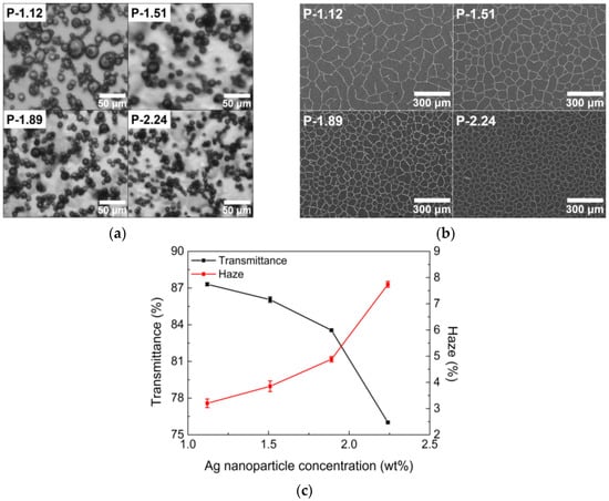 An increase in the concentration of nanoparticles usually enhances emulsion stability [,]. When Ag nanoparticles were dispersed in the emulsion, the interfaces between the water and toluene in the emulsion became covered with AgNPs and a particle layer was formed around each water droplet, which prevented the coalescence of water droplets and stabilized the emulsion. When additional nanoparticles were added, large water droplets were broken down into smaller ones because a greater number of AgNPs could then be adsorbed on the droplet surfaces. Therefore, an increase in the nanoparticle concentration can effectively reduce the average size of the emulsion droplets [,], as shown in Figure 2a. In addition, Figure 2b shows that the size of open cells surrounded by AgNPs decreases with an increase in the concentration of AgNPs. The change in cell size can directly affect the optoelectrical properties of the TCFs. The decrease in open cell size leads to the degradation of the optical properties of the TCFs; that is, the transmittance decreases and haze increases, as displayed in Figure 2c, because the open cell size is normally responsible for the optical properties.