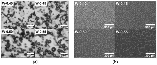 As the droplet size increases, the total surface area of the droplets with adsorbed AgNPs tends to decrease. Therefore, the conductive lines become wider because of the constant concentration of AgNPs, resulting in a decrease in sheet resistance (Figure 5a,b). However, in the W-0.55 case, the sheet resistance is rather high because the network is not tightly formed. The particularly high sheet resistance of the W-40 sample is due to the large number of small break-ups of conductive lines, which is caused by the relative insufficiency of AgNPs owing to the increase in the total surface area of the droplets, as shown in Figure 5a. Based on the results shown in Figure 4 and Figure 5, W-0.50 was considered the optimal water fraction, providing good optical properties and low sheet resistance.