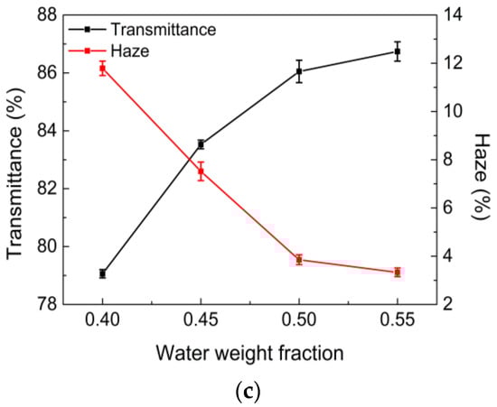 To determine emulsion stability and droplet size, numerous factors can be used, including the weight ratio of the two solvents [], nanoparticle concentration [], structure of surfactants [], stirring intensity [], mixing time [], and mixing temperature [,]. In addition, coating conditions, such as coating thickness and drying temperature, are important because they can affect the coalescence degree of droplets and the corresponding final structures of the TCFs by regulating the total drying time. Therefore, the establishment of proper emulsion preparation and coating conditions is indispensable for the optimal performance of TCFs.