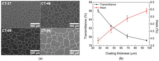 There is a trade-off between the optical and electrical properties with increasing coating thickness, which means that the optimal coating thickness of TCFs can be determined, depending on the required properties for various applications. The required performance of TCFs for touch screen applications should satisfy a sheet resistance of 30–40 Ω/□ and a transmittance of 85% or more. Therefore, it is confirmed that a coating thickness of 27.4 μm is optimal. Notably, in a network structure with a very thin wet coating (thinner than 27.4 μm, for example), it is expected for a large number of break-ups to occur because of the extremely high drying rate.