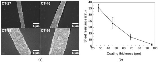 A thicker coating indicates an increase in the loading amount of the emulsion; accordingly, there are more AgNPs consisting of conductive lines, making the conductive lines wider and denser, as portrayed in Figure 7a. There is little possibility of current leakage as the coating thickness increases. Therefore, the sheet resistance decreases as the coating thickness increases (Figure 7b).