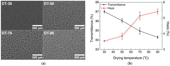 When the drying temperature is low (for example, 30 °C), the drying speed is slow enough to easily induce the coalescence of water droplets. Consequently, the size of open cells becomes relatively large (Figure 8a). As the drying temperature is gradually increased to 70 and then to 90 °C, cell size decreases because rapid drying prevents the coalescence of droplets. Therefore, the transmittance decreases and haze increases with increasing drying temperature (Figure 8b). A higher drying temperature induces a smaller open cell size, reducing the width of the conductive lines under a constant AgNP concentration (Figure 9a). Therefore, the increased sheet resistance was measured at high drying temperatures because of the higher possibility of conductive line break-ups (Figure 9b). Note that drying temperatures over 70 °C do not significantly change the sheet resistance because the emulsions dry very rapidly at such temperatures.