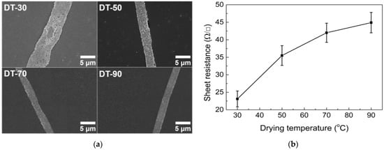 (a) SEM images of conductive lines in TCFs and (b) sheet resistance under different drying temperature conditions.