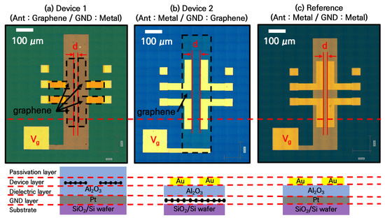 A passive device with a transmitter and receiver of two basic dipole antennas integrated on the same plane was fabricated to study the reconfigurable passive device using graphene. Device 1 consisted of 100 μm pitch ground–signal–ground (GSG) pads, as shown in Figure 1a, with a graphene antenna width of 50 μm and length of 450 μm. The thickness of the Al2O3 gate dielectric was 20 nm (dielectric constant = 6). The antenna itself was simply designed to operate at approximately 660 GHz, with resonance at 10–20 GHz. The ground plane was made of metal and platinum (Pt) to control the Fermi level of the graphene. The spacing between the transmitter and the receiver was alternated between 10 and 150 μm to observe the changes in signal-transmission characteristics. The Fermi level of the graphene could be controlled using the bias applied to the Vg contact shown in Figure 1a. Device 2, shown in Figure 1b, was a variation of Device 1 in which the ground plane was replaced with graphene. As the device capacitance was determined by the overlapping region of the metal and graphene, the total capacitance was expected to be similar to that of Device 1. As a reference, a similar device made of a metal (Au) film was fabricated, as shown in Figure 1c.