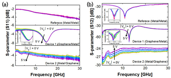 Consequently, the degree of resonant frequency variation regarding the reflectance and transmittance due to the Vg was compared, as shown in Figure 4a,b. For the reference passive device, no resonant frequency change due to the Vg could be observed. However, a change in resonant frequency could be seen when the graphene was used. For S11, when Device 1 was exposed to a larger Vg value, an approximately 100 MHz shift towards the lower frequency was observed. However, for Device 2, the resonant frequency increased by approximately 200 MHz. The analysis results of Figure 4 show that the impedance of the antenna was affected more by a change in the S11 characteristics. An increase in the resonant frequency bandwidth indicated an improvement in signal transmission in the 15 GHz band. In Device 2, the resonant frequency shift and reflection decrease in the 4 GHz band could be attributed to an increase in carrier concentration caused by changes in Fermi levels. This resulted in improved signal transmission through the graphene ground plane. For S12, the shift width of the resonant frequency was more than that of S11, as shown in Figure 4. For both Device 1 and 2, the resonant frequency changed due to the Vg occurring approximately 1.5 times more, i.e., Device 1 and Device 2 exhibited a resonant frequency change of approximately 200 MHz and 300 MHz, respectively.