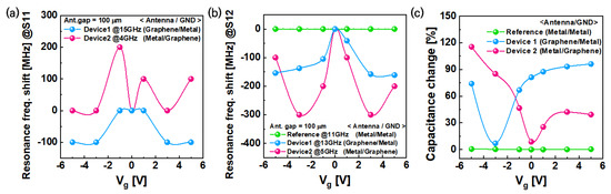 Increasing the carrier concentration of graphene in passive devices improved the RF signal transmission, and the quantum capacitance changes induced a change in the resonant frequency. The capacitance value of each passive device was measured to examine the correlation between the S-parameter characteristics and the capacitance changes in the passive device, as shown in Figure 4c. For Device 2 (Figure A2a), where graphene was used as the ground plane, a capacitance change of approximately 15 pF was measured due to the graphene quantum capacitance changes. Although the capacitance of the reference passive device (Figure A2b) was higher than that of Devices 1 and 2, the capacitance variation by the Vg was approximately 0.5 pF, which is approximately 30 times lower. Figure A2c compares the capacitance measurement results of Device 1, which used graphene as the antenna, and Device 2, which used graphene as the ground plane. The Dirac point not appearing near 0 V implies that the graphene was doped. As the Dirac point of Device 1 appears near −2.5 V, the graphene could be considered to be n-type. Since the Dirac point of Device 2 was measured by directly applying Vg to the graphene, the Fermi level shift was observed in the direction opposite to the graphene Fermi level shift in Device 1, i.e., as the Fermi level moved in the positive (p-type) voltage direction in Device 2, it mirrored the capacitance measurement value of Device 1. Figure 4c shows the rate of capacitance change. Owing to the changes in the quantum capacitance of the graphene, the capacitance value changed by approximately 120% as the Vg increased.