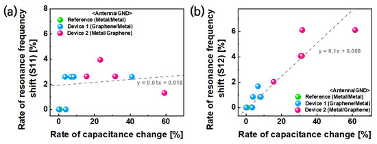 In this experiment, we changed the resonant frequency in a passive device using graphene. The relationship between the rate of resonant frequency shift and the rate of capacitance change was investigated based on Vg = 0 V. As shown in Figure 5, 6% of the rate of transmittance resonant frequency shifted in correspondence with the rate of capacitance change that could be observed, regardless of the applied structure of graphene in the passive device. Additionally, the reflectance S-parameter value of the graphene RF devices changed minimally when compared with the reference device, and the rate of reflectance resonant frequency showed a 2% level shift, regardless of changes in the carrier concentration of graphene based on gate bias. Therefore, we can conclude that graphene RF devices can be reconfigured by gate bias without energy loss. When the total capacitance change of the passive device was 60% due to the graphene Fermi level change, a resonant frequency shift corresponding to 6% of the original resonant frequency value occurred.