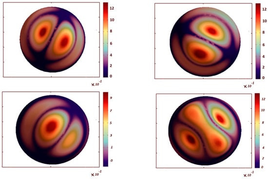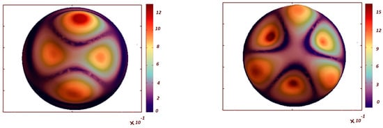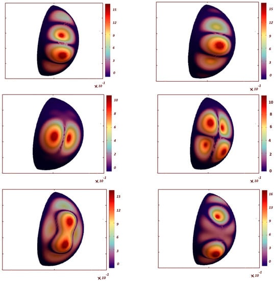Table 6 shows the effect of the porosity coefficient on the critical buckling loads of FG-GPL, porous spherical shells (PD1, γ = 0.01 wt%, GPLX). When the porosity of the structure increases, the critical buckling load of FG–GPL porous spherical shells decreases, because of the decreased structural stiffness. The comparative evaluation of Table 3, Table 4, Table 5 and Table 6 denotes that the influence of the porosity coefficient on the critical buckling load is lower than the GPL pattern and weight fraction of the nanofiller (its impact is approximately equal to 12.5%). On the other hand, the effects of the GPL pattern, porosity distribution and weight fraction of nanofillers on the critical buckling loads of FG–GPL, porous spherical shells are more pronounced than the porosity coefficient. The first six buckling mode shapes are shown in Figure 3 and Figure 4 for the clamped spherical caps with = 180°, = 180° and 90°, respectively. The figures clearly show that the first two buckling mode shapes and loads for each polar angle of spherical cap are the same. It is also observable that the number of buckling waves increases for higher buckling modes.