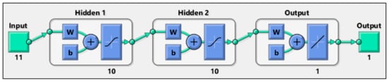 Data sets are converged to a matrix, imported into MATLAB script, and normalized. These parameters are used for training, validating, and testing the models. The data points are randomly divided into 2 sets including training (80%), and testing (20%), as evidenced by some recent studies [118,119,120]. The Levenberg–Marquardt method is used to train the feed-forward ANN model. The fitnet function in MATLAB is used to fit an ANN model to the data. Furthermore, the ‘trainbr’ training function is employed where Levenberg–Marquardt optimization is used to updating the weight and bias variables. To create a network that generalizes well, it first identifies the optimal mix of squared errors and weights. The trial-and-error process is carried out according to the hyperbolic tangent sigmoid transfer (tansig) activation function in the hidden layers and the pure linear transfer function (purelin) in the output layer as a suitable structure of the ANN model. In addition, the accuracy of the model directly depends on the number of hidden layers and the number of neurons. Various ANN model configurations were evaluated, and the final model was selected with two hidden layers having ten neurons in each layer, as schematically shown in Figure 1. The finalized model was run several times to obtain the best values of the correlation coefficient for the actual and predicted values for both data sets.