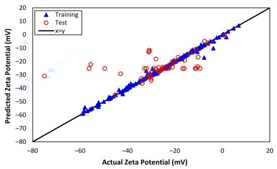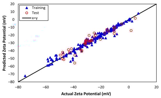 Actual and predicted zeta potentials from ANN (training and test data).